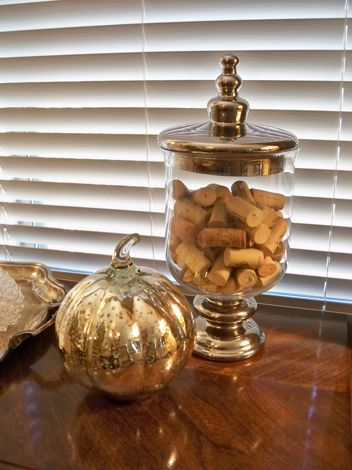 Then I thought maybe some corks would look good since it is next to a tray of crystal decanters.