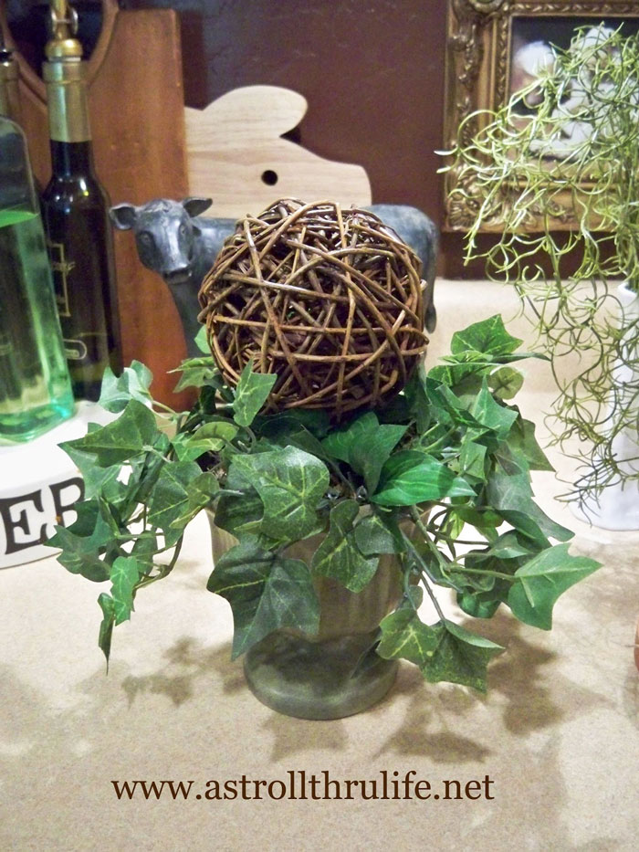 I thought this little urn would be fun to add a wicker orb too. I had a few sprigs of ivy in my stash, so I added that to the base.
