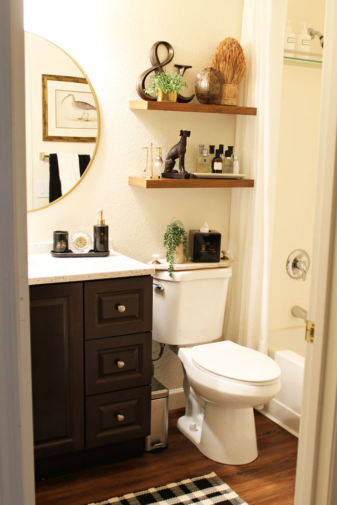 A couple of small pots add tons of interest to these bathroom shelves.