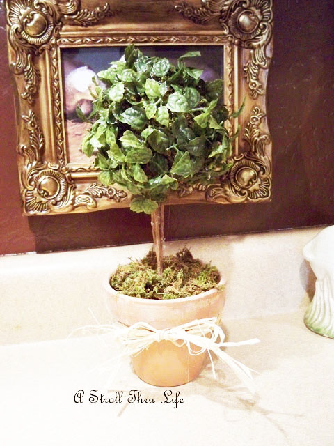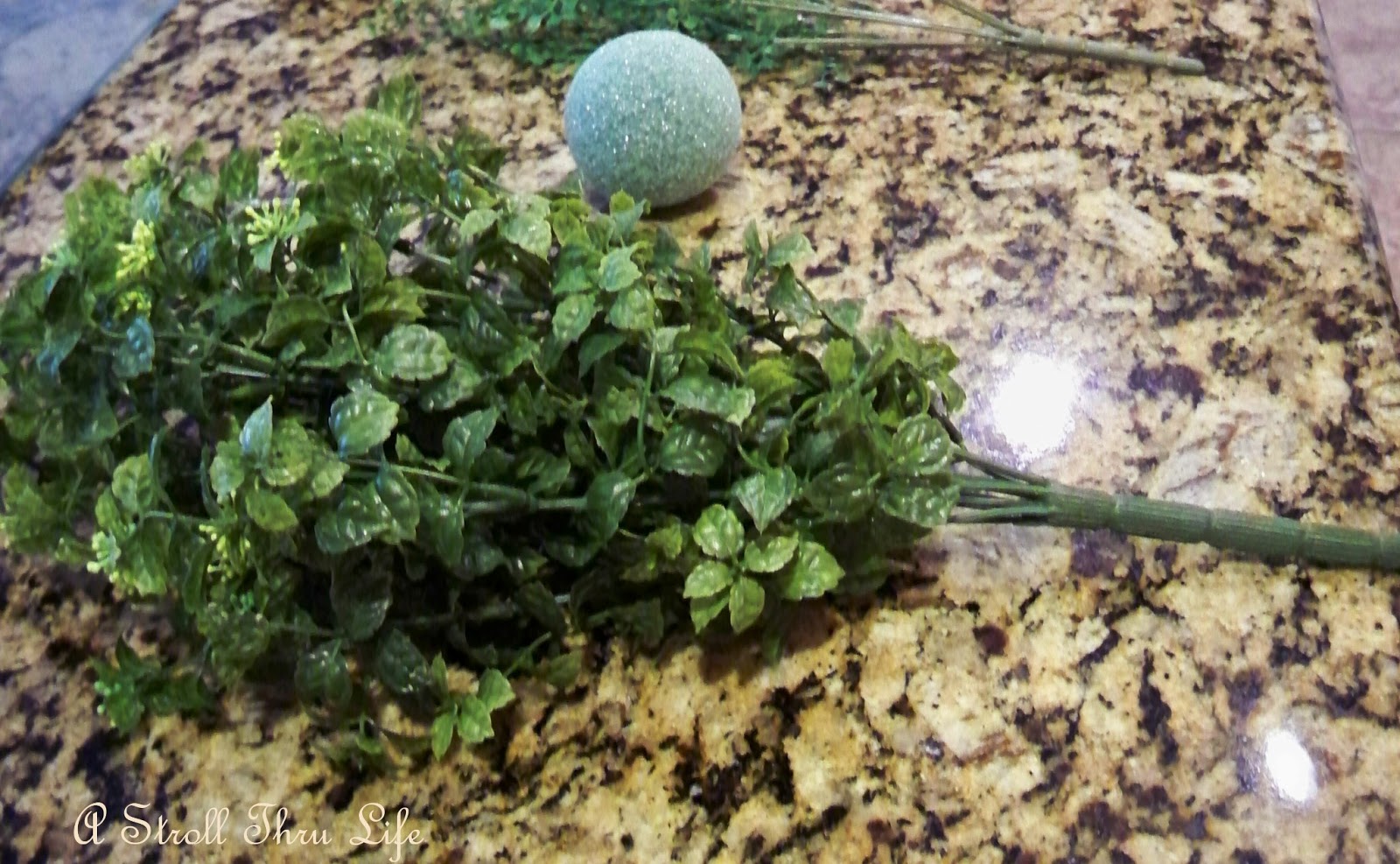 Ok, back to the topiary. This is what I am going to use to create a faux boxwood look. The small styrofoam ball and the leaves off of this bush.