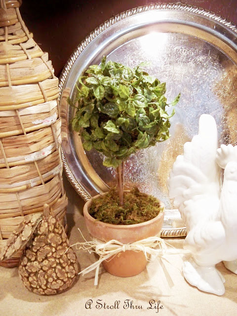 I am still on a kick trying to create some fun and trendy greenery for my vignettes. Topiaries are all the rage right now in all sizes and shapes, but the prices are a little much for my budget, especially since I want several things. So as I showed you in this post, I made a trip to the Dollar Tree and Hobby Lobby for greenery and pots. I spent a total of $20 and change.