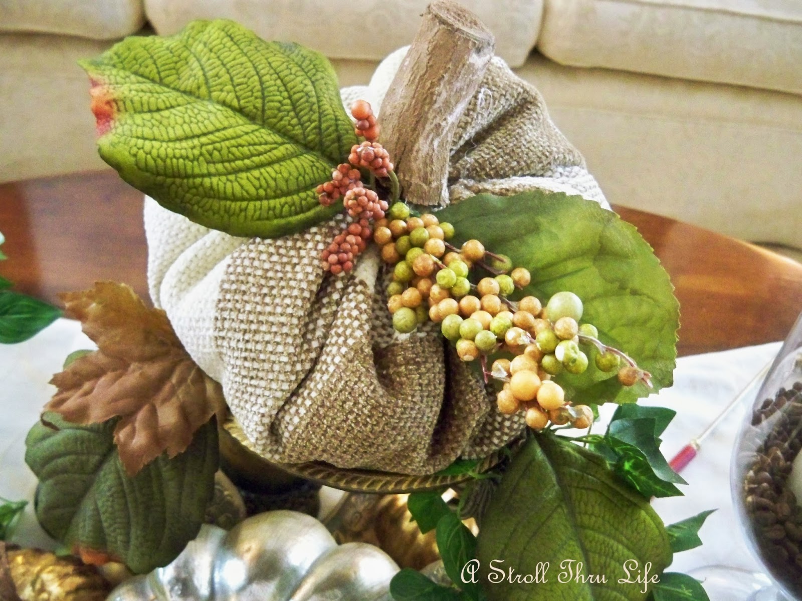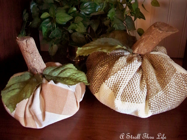 This is the tutorial I shared last year on how to make fabric pumpkins.  Mind were really simple, this is what I started with this year.  Just a couple of leaves, so I thought they needed something extra.