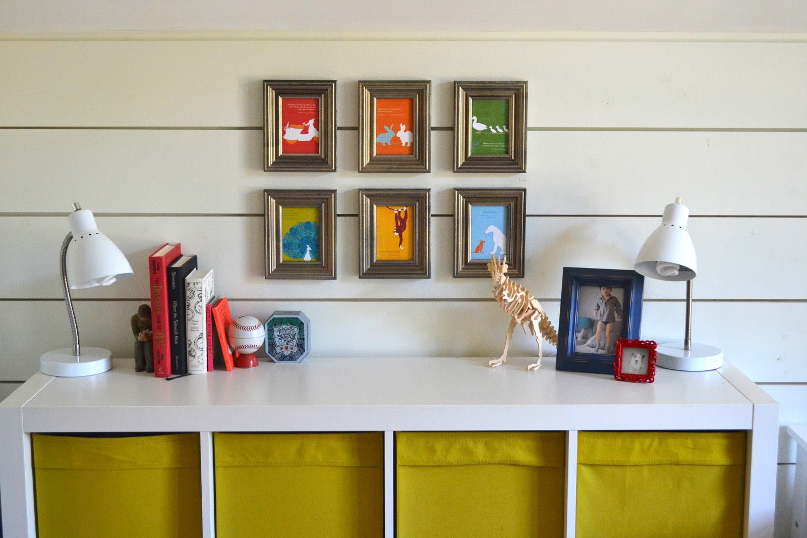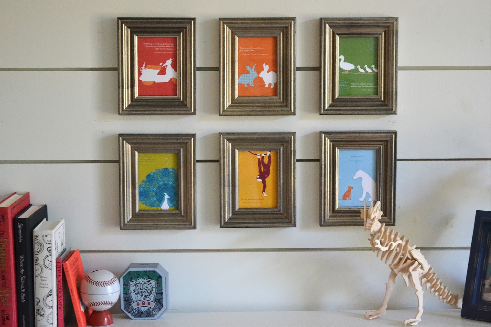 I added bright accents through these framed greeting cards as well as a thrifted chair that I reupholstered with a blue zebra fabric.
