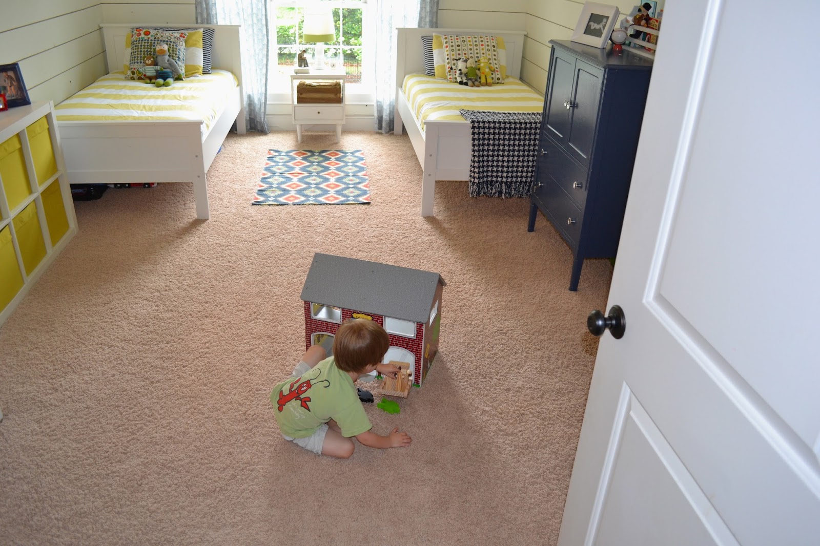 When I went about turning our playroom into a dual bedroom for my two sons, my top priority was leaving them enough room to play.  Since we would be eliminating their playspace, I knew we would need to let them have the floor space to play, wrestle, and generally destroy things!  I also needed a lot of storage for all of the toys that would still remain in this room.  I want my kids to have fun but I don’t want to look at all of their junk all of the time!