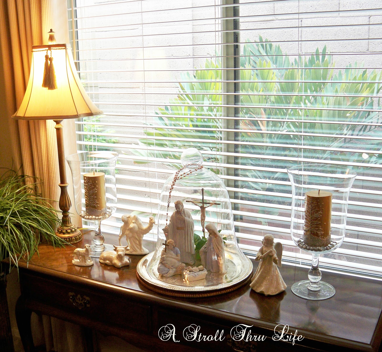 A couple of years ago I found the animals and angel to complete my set.  I flanked them with two  hurricanes holding gold leaf candles embellished with silver glitter trees and snow.