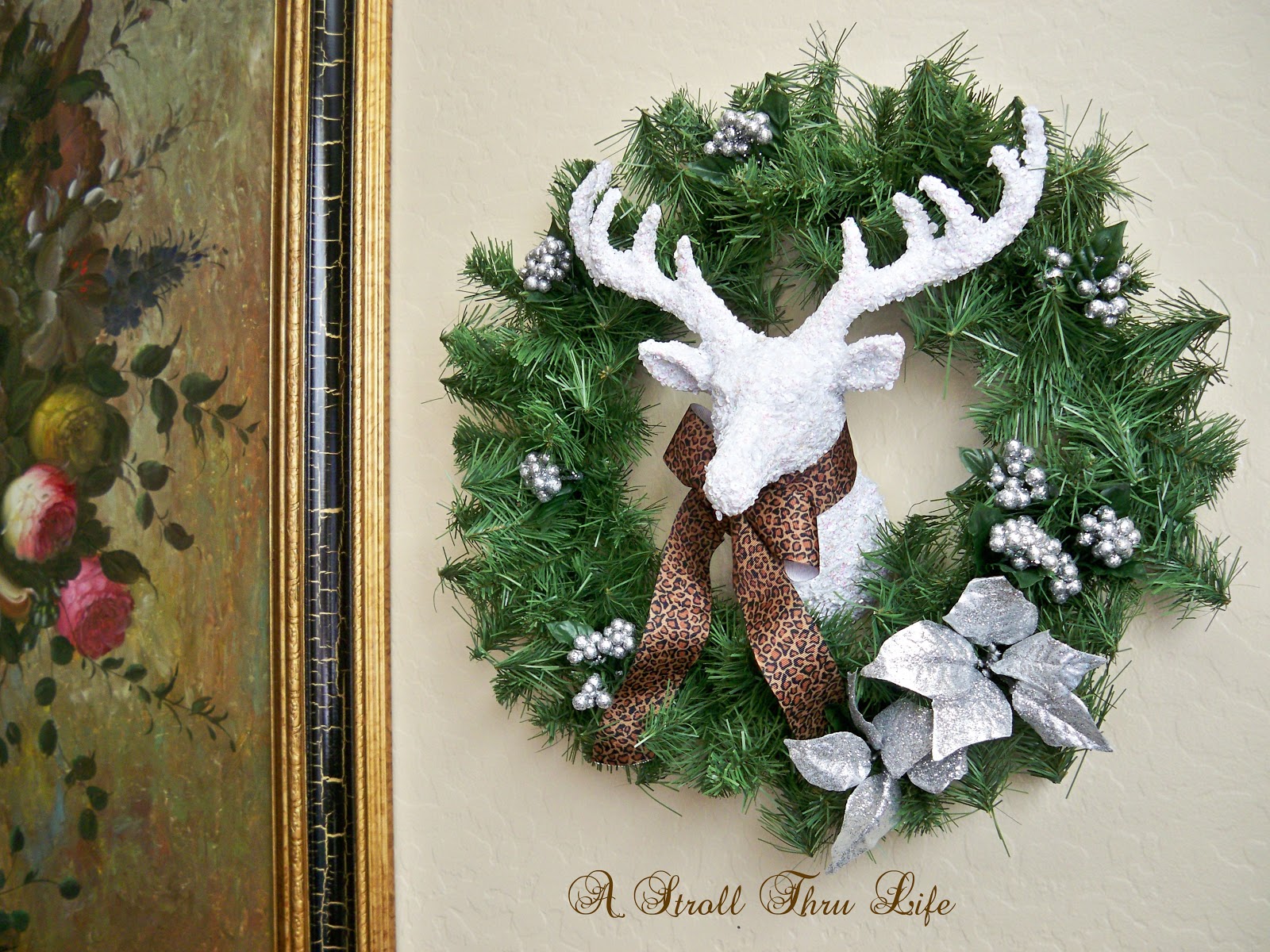 I replaced the sconces with sequined reindeer surrounded by thrifted wreaths and $1 store berries and flowers.