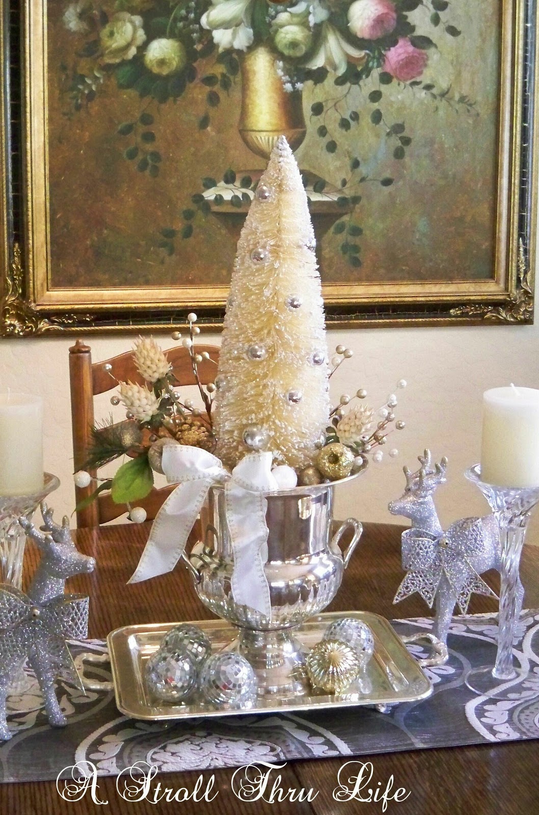 Add some thrifted crystal candlesticks and the centerpiece is done.