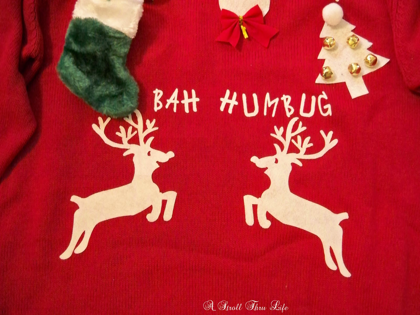 We used the white felt to cut out snowflakes, reindeer and a tree, then used fabric glue to attach them to the sweater. A red bow and wiggly eyes for the reindeer and bells for the tree. Iron on letters spell out our HO HO HO and Bah Humbur. I had a small stocking ornament,so I sewed it on and also sewed on a couple of small presents.