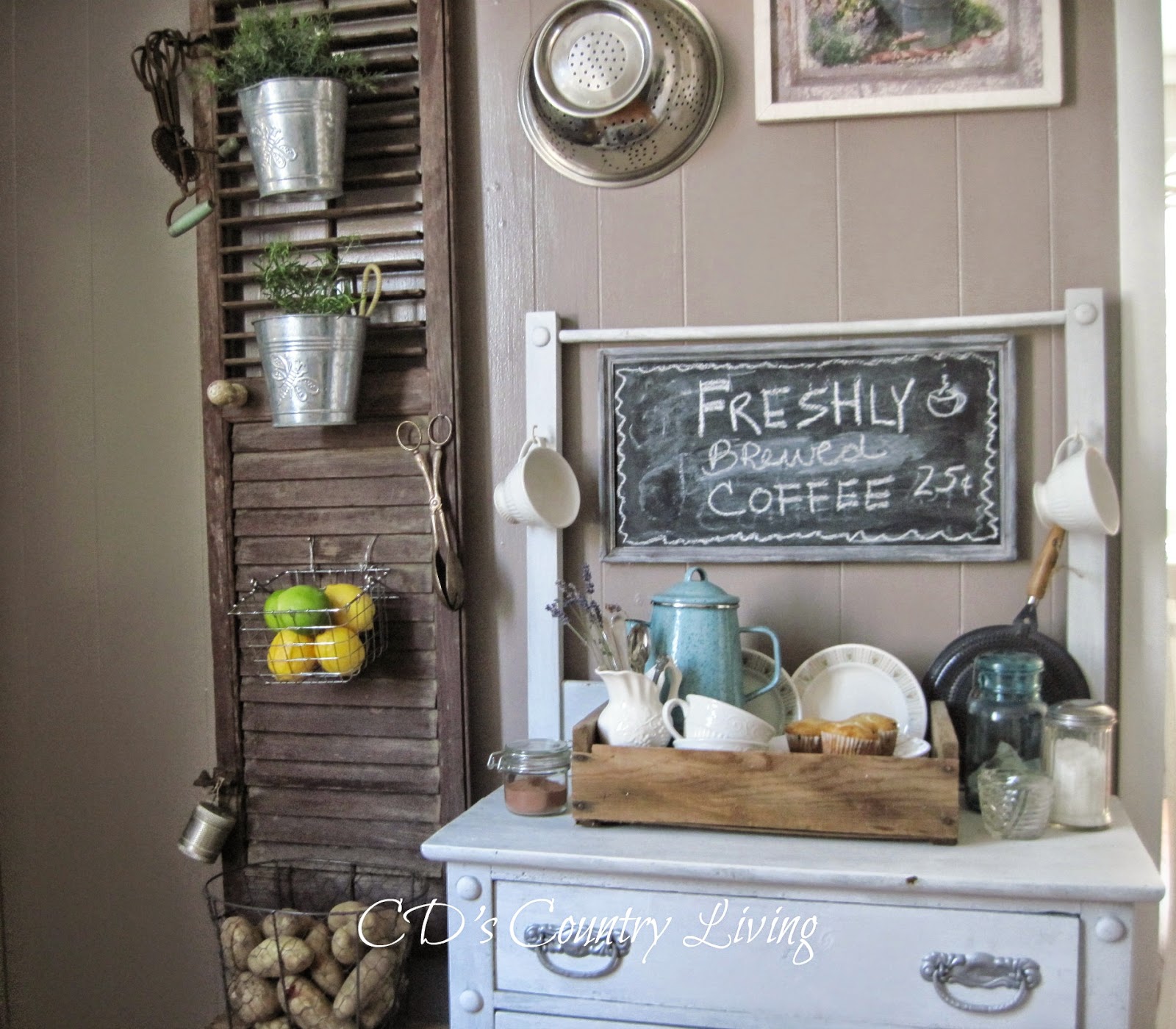 CD’s Country Living has been in a purging and organizing frame of mind before starting a full kitchen remodel. I love how she’s repurposed this antique shutter for some of her kitchen accessories.