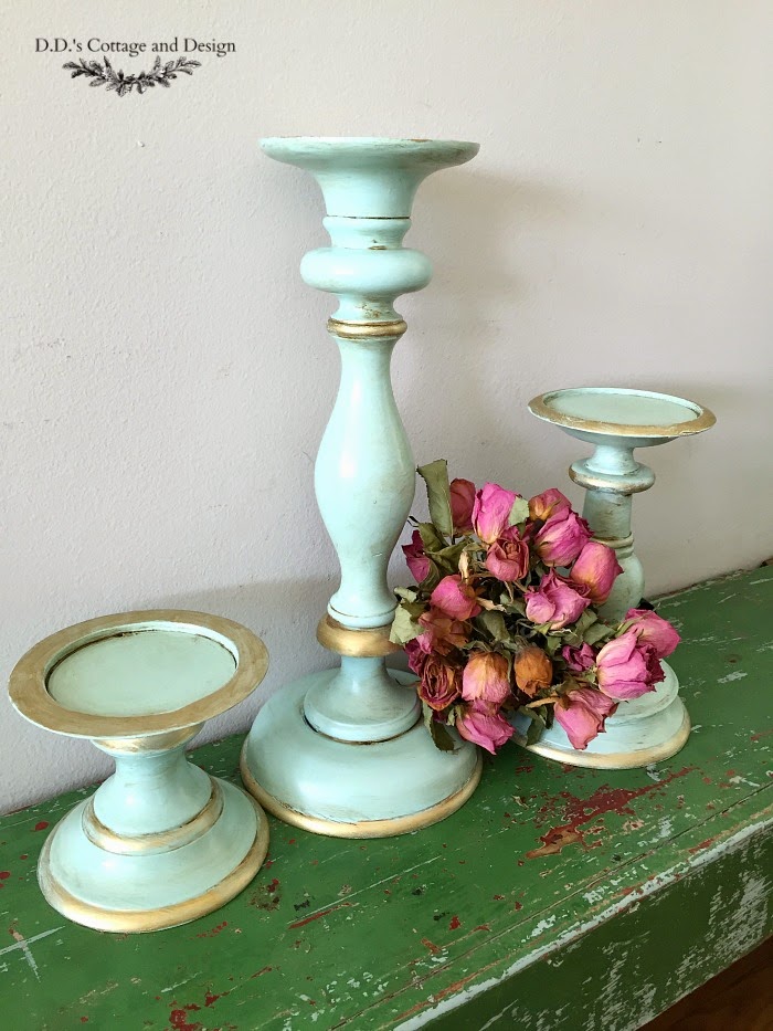 I love this makeover that D.D.’s Cottage shares. These candelsticks look amazing in the soft aqua and gold gild. Stunning.