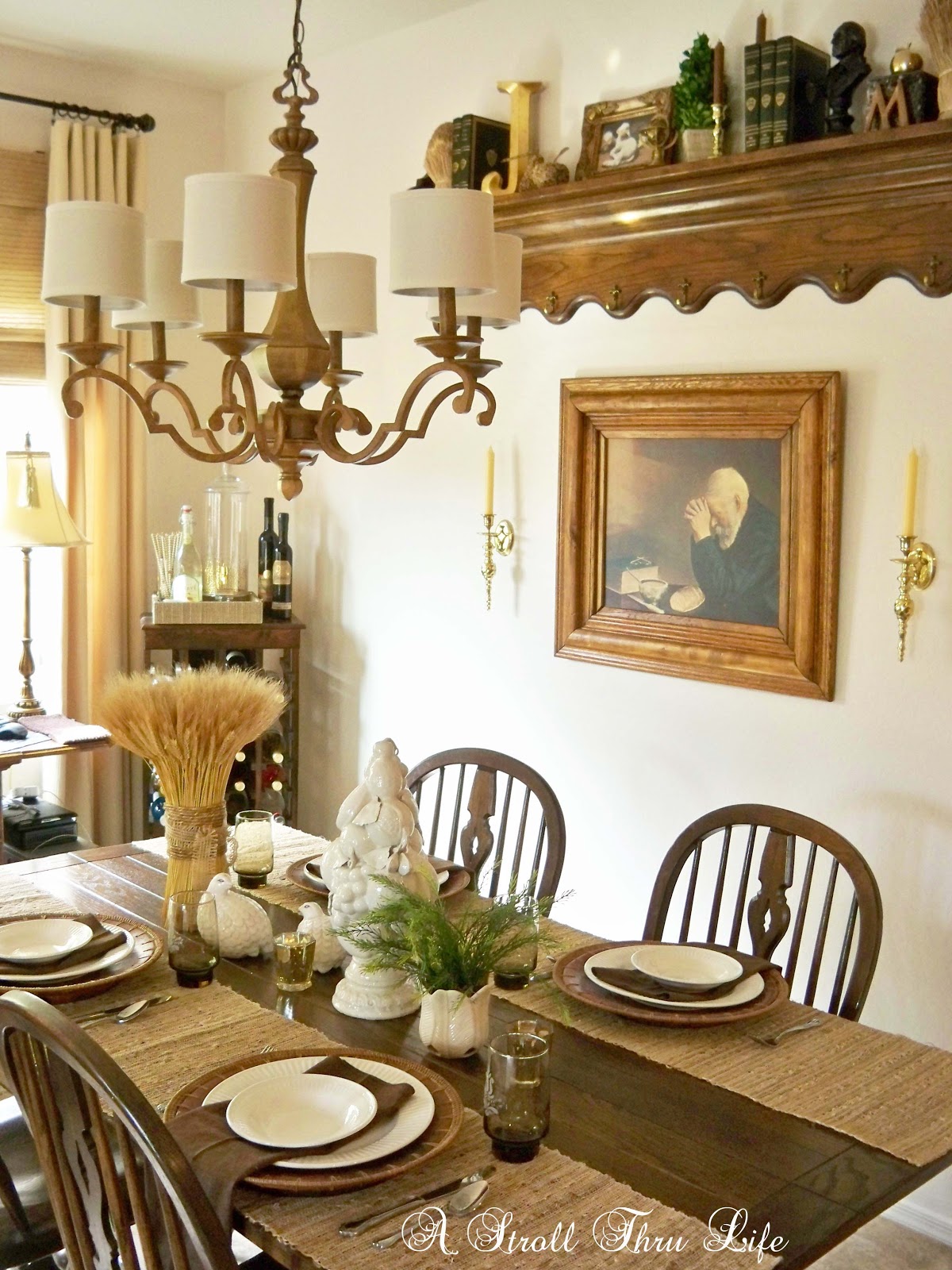 OK, I really, really think I am through fussing with this room and the chandy. I have tons of other projects to get to, but I just couldn’t resist trimming the chandy shades. I lived with them plain for a while and that looked really nice, then I pinned some trim on one and lived with that for a while. Of course the trim won out.