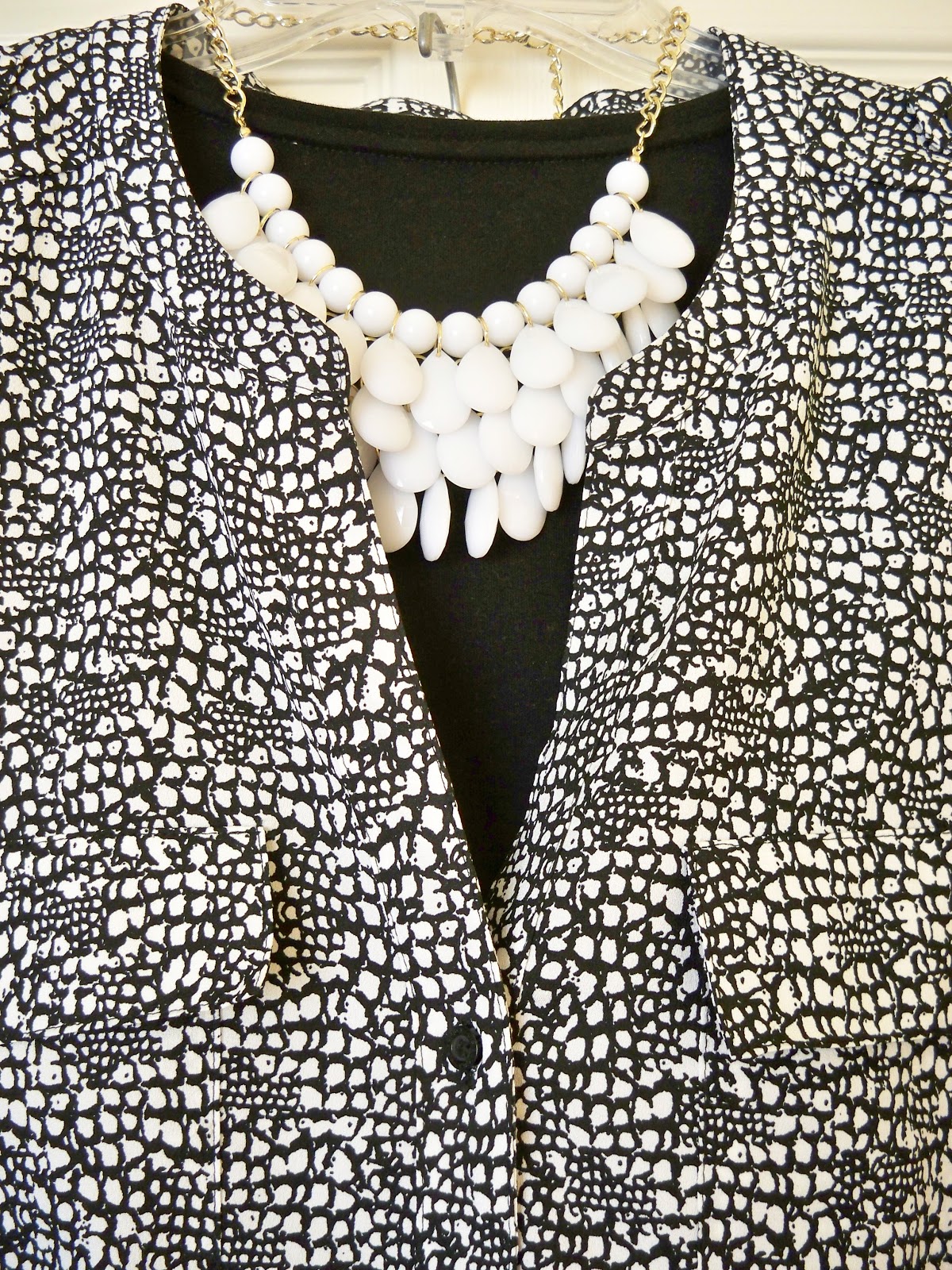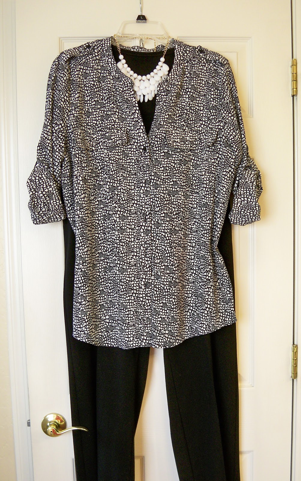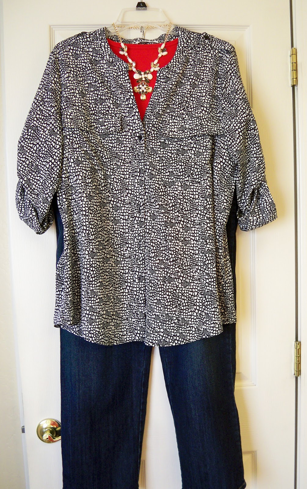 It is cooler in the NW than here in the desert, so layering sounded like a great idea. I love this black and white silk blouse layered with a red tee. Pair this with a pair of jeans and tennis shoes or boots for a casual look.