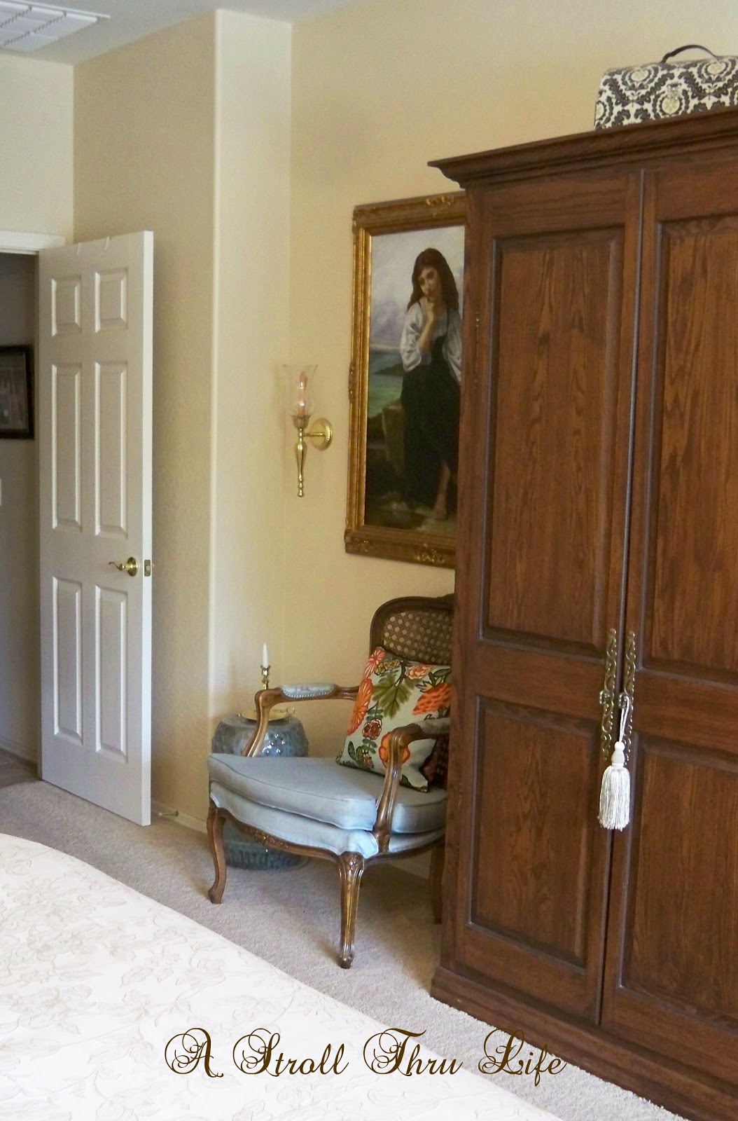 The other side of the bed has my favorite frenchy chair and a little garden stool.