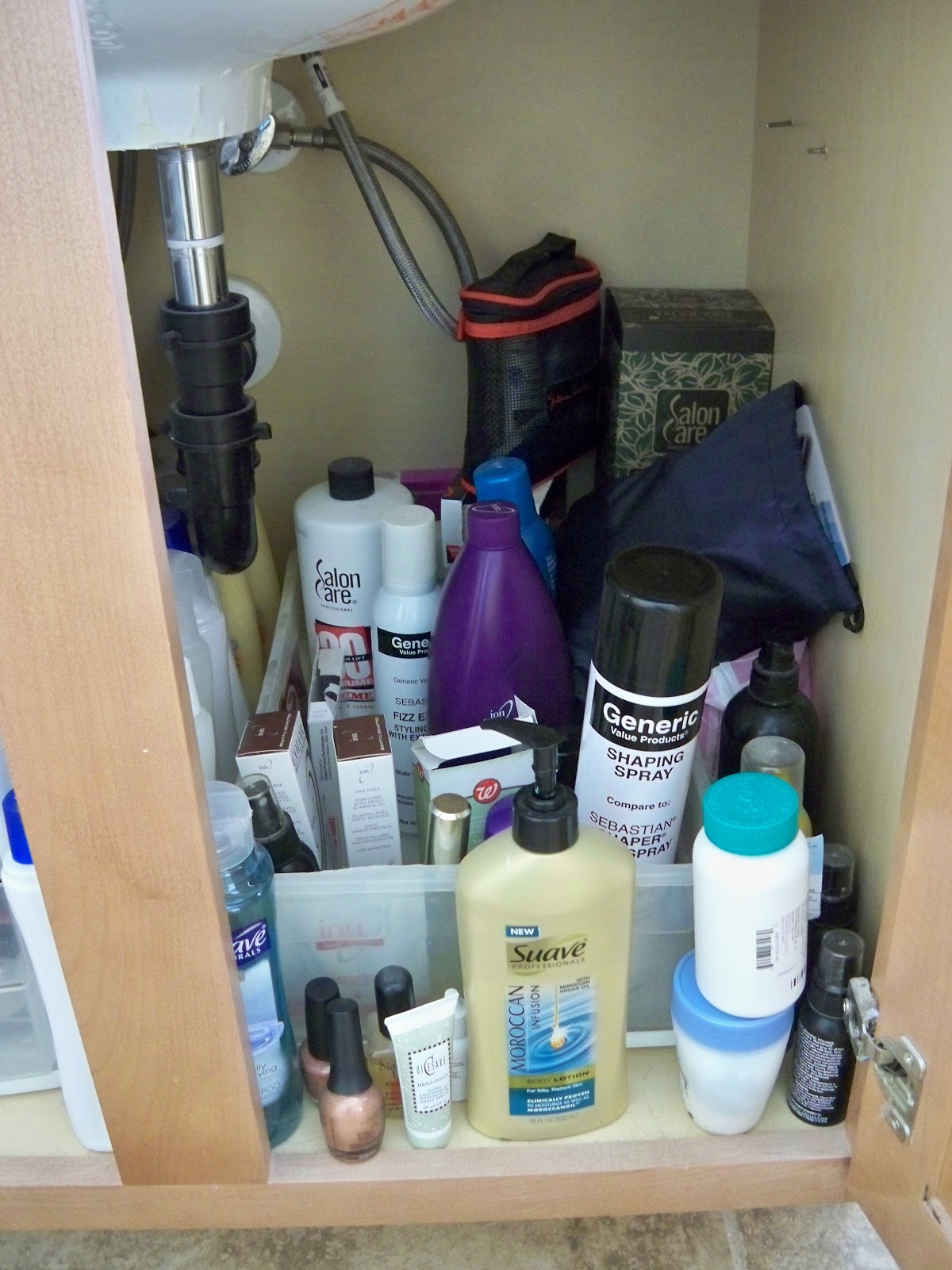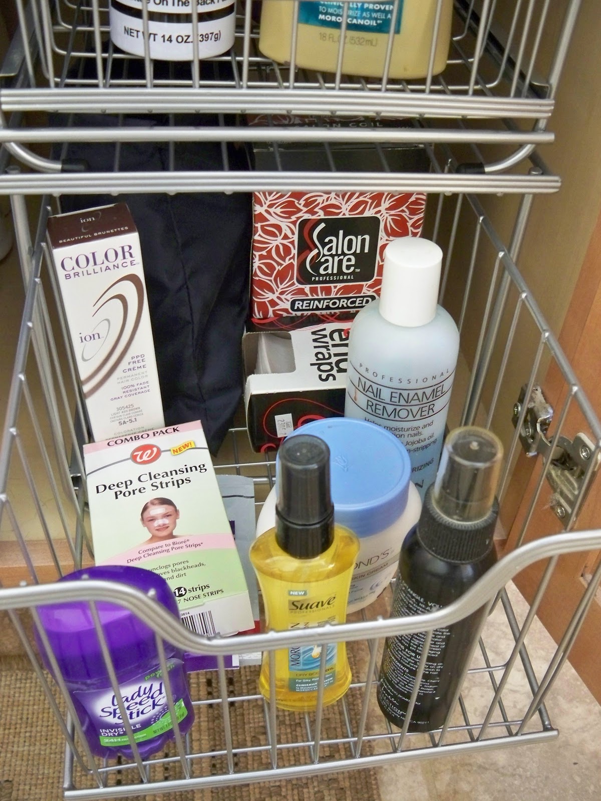 The bottom one holds misc. things for hair color, nails and and cleansing.