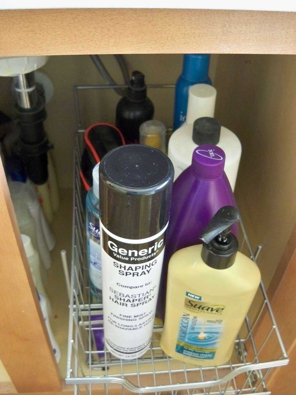 Our bathroom is really builder basic. No storage at all behind those doors, so I have been trying to be creative and find things that work.
