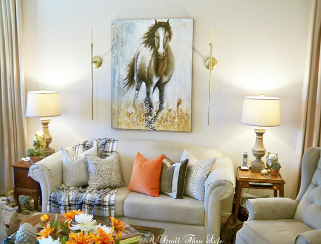I love the new horse painting I found for the familyroom wall, and I love the size, but I thought it needed something to finish off the space. A pair of candle sconces would be perfect.