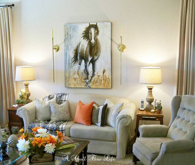 Then this is the room with the painting — Love how the painting totally changed the feel of the room, but it needed something – I just didn’t want to take away from the painting, just something to finish off the wall space.