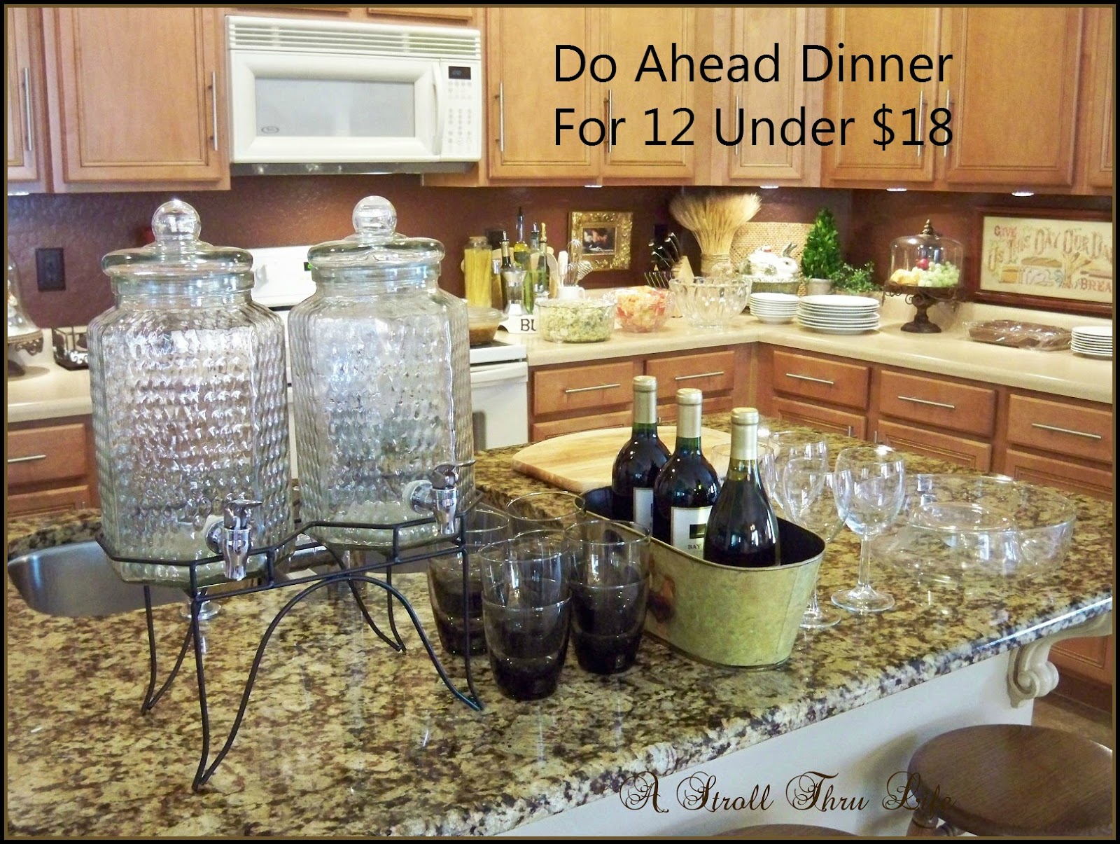 I love to entertain and I also love to have it be really easy and not break the bank. I know some of you have made comments that you don’t have the dishes or time to put a big meal together for a lot of people. This is one of my go to meals that can be completely done the day before and all of the dishes came from Goodwill or the Dollar Tree. With some budget shopping this meal for 12 is under $18 and there will be leftovers.