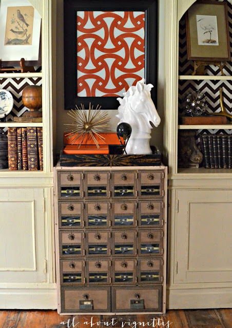 Now what would you do with a bunch of antique mailboxes – All About Vignettes put these to use for her wine. You have to go see how it all came together.