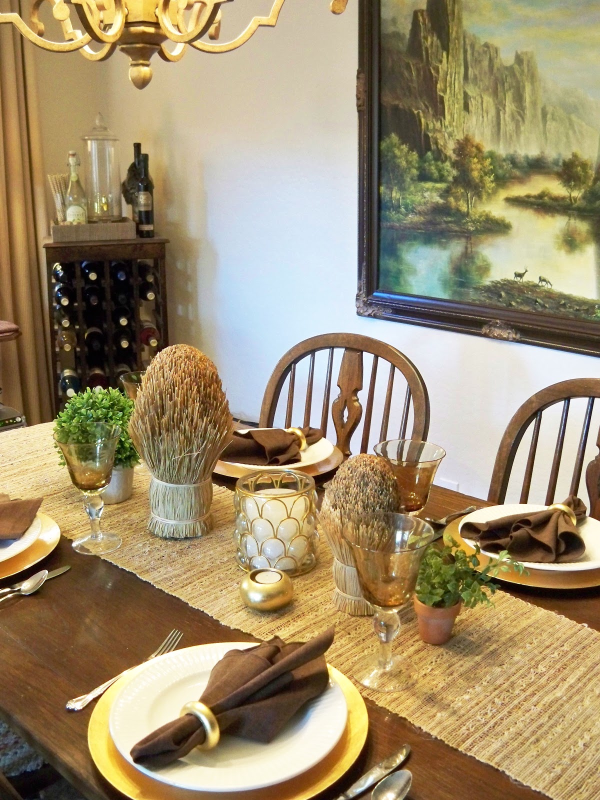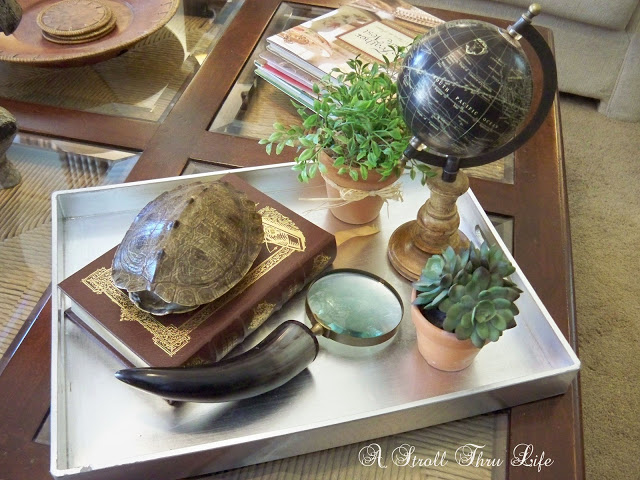 I shared this arrangement yesterday that I created for the dining room table.  These little pots of plants pulled all the diverse elements together for a cohesive display.
