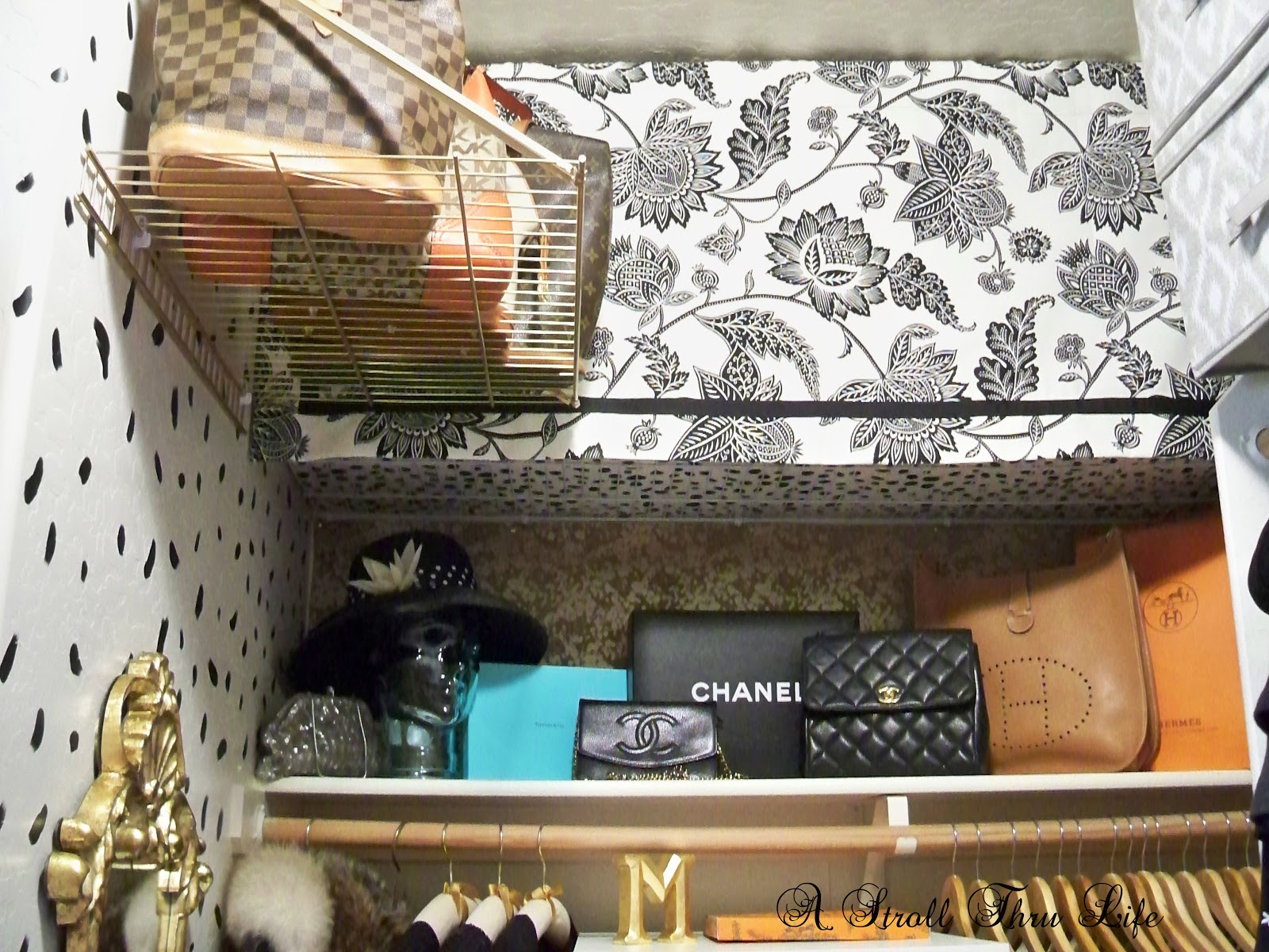 I made a fabric shade so you can’t see all the quilts, but things are easy to get to.   Then used the bottom shelf to display some pretty things.  I love my handbags, so it’s nice to see them on display so I can enjoy them and reach them.  I added another wire shelf that I spray painted gold on the small section of wall to hold even more handbags.
