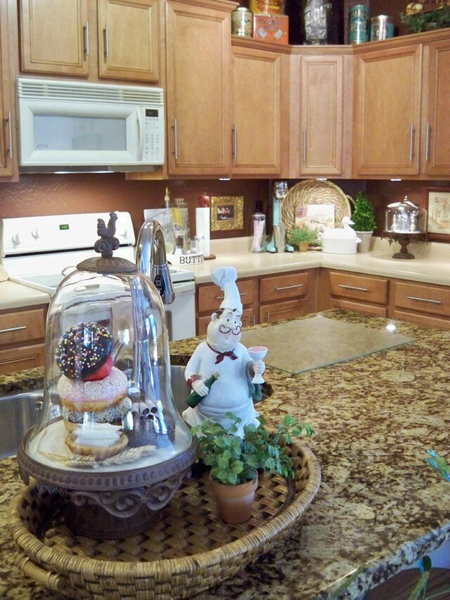 I placed my favorite cloche on the island. I think that little french chef baked up a storm and then drank way too much wine. haha (Love my new Pfister Faucet)