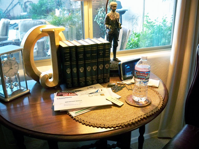 I need to take 5 minutes to pick up everything and put it away, then do something to make the table pretty. Since you see the table from the front door, a simple pretty centerpiece and tablesetting is all that’s needed to make it look like I care.