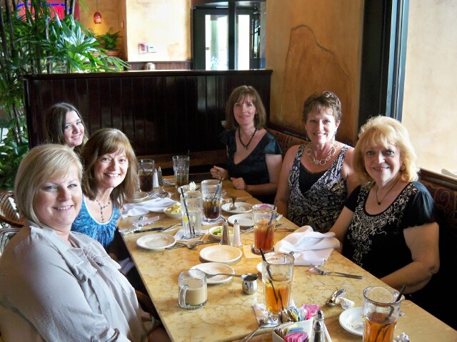 Out of all that group there were a few of us that became good friends and have continued that friendship today. Some are still blogging and others aren’t but we all love getting together. From left to right – Liz (Rose Vignettes) , Linda, Laura’s daughter aka The Fashionista, Laura (Decor To Adore), Cindy, Ceekay. Missing in this photo is Jamie. (She’s the beautiful lady on the right in the brown dress in the above photo)