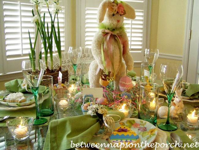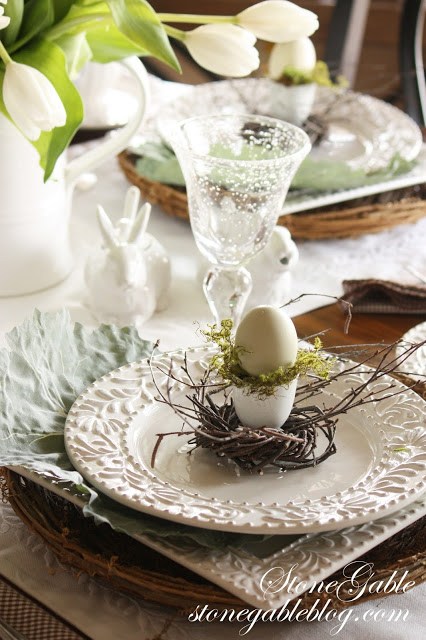 Susan @ Between Naps On The Porch is definitely the master of tablescaping. I love, love, love this bunny one. She has several to see also and they are all stunning.