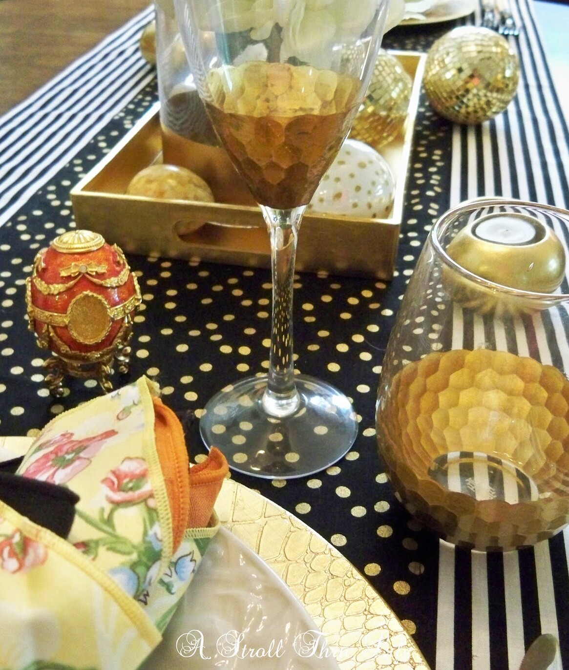 Last year I did a really simple tablescape in black and white. Each placesetting had a different special Faberge Egg. Use some of your collections to make each placesetting special.