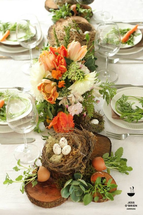 I really like this centerpiece of wood slices and birdnests from The Little Big Co.