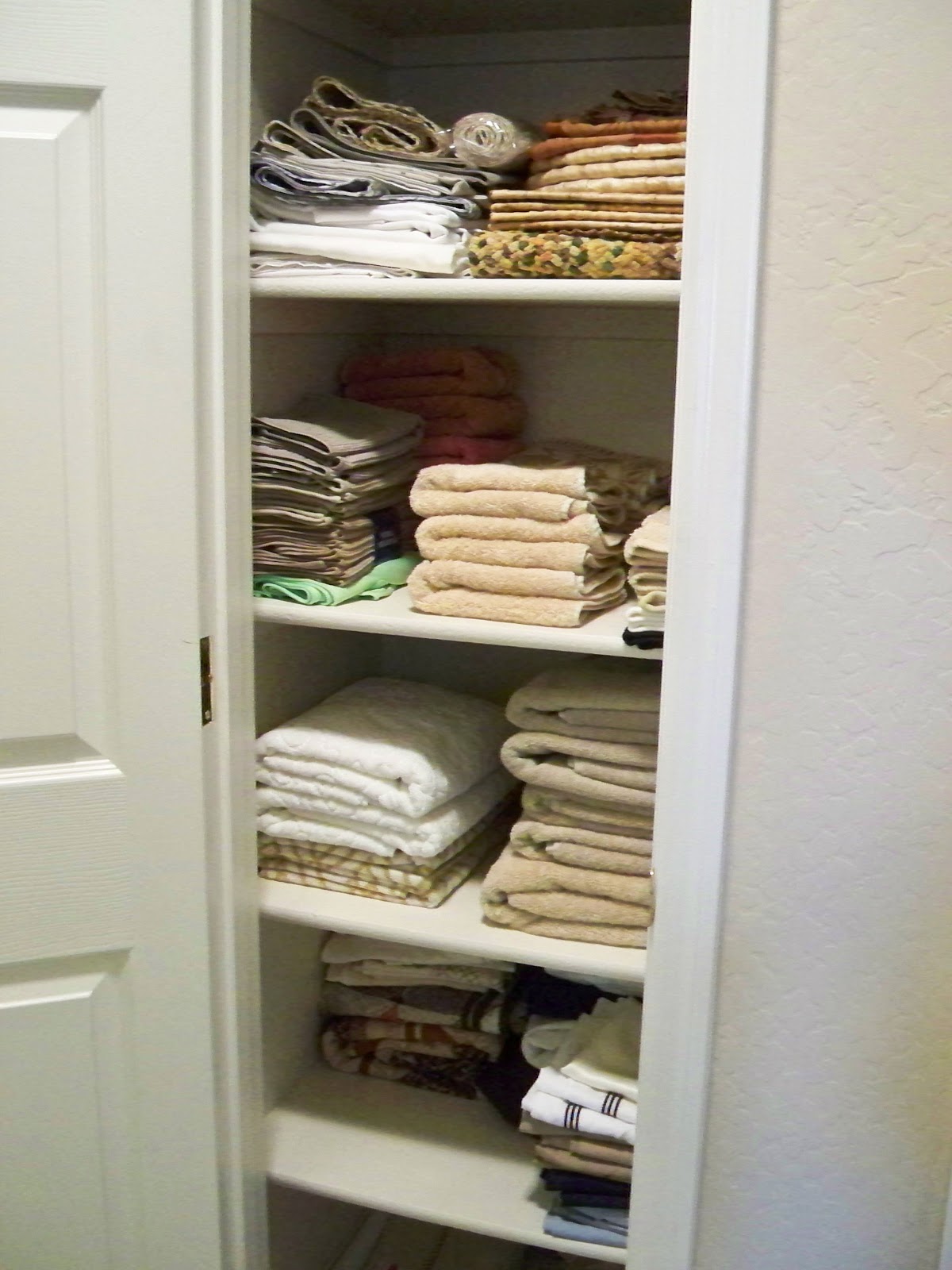 This is what we really use, so this is what I kept.  The top shelf is place mats and table runners.  Next is hand towels, wash cloths and kitchen towels on the left.  Third shelf is bath towels.  Bottom shelf is guest room sheets in the back, pillow cases on the right and an open spot for some new King Sheets.