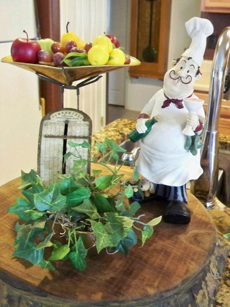 The kitchen island got a really easy and simple change too. The marble egg and rooster gave way to a little French Chef.