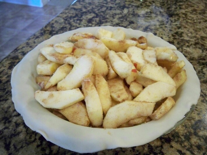 Peel all the apples _ I used 8 for a 9″ pie. Then sprinkle 1/2 c. sugar. 1/2 c. brown sugar, 3 tbl, flour and 2 tbl. cinnamon on top and stir to coat all the apples.