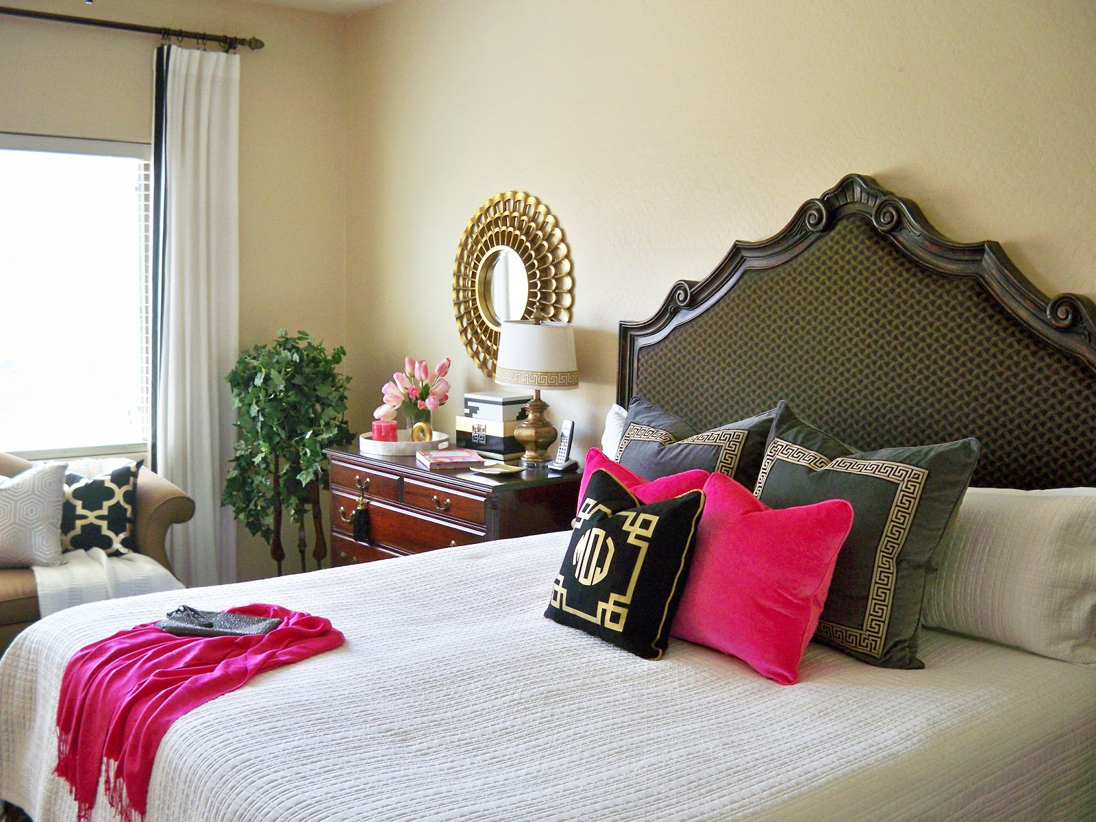 I have been busy looking at different ideas for changing up the Master Bedroom for Summer.  I already love the gray Ikea euro pillows that I spruced up with some greek key ribbon, so I wanted something to use with them.  I have seen some really pretty Pink and Gray and Pink and Black rooms lately, I loved them and thought that would be fun for a change.   I found some really pretty velvet online and ordered it.  Well, I was definitely surprised when I opened the package.  It is really, really pink, but I totally love it.