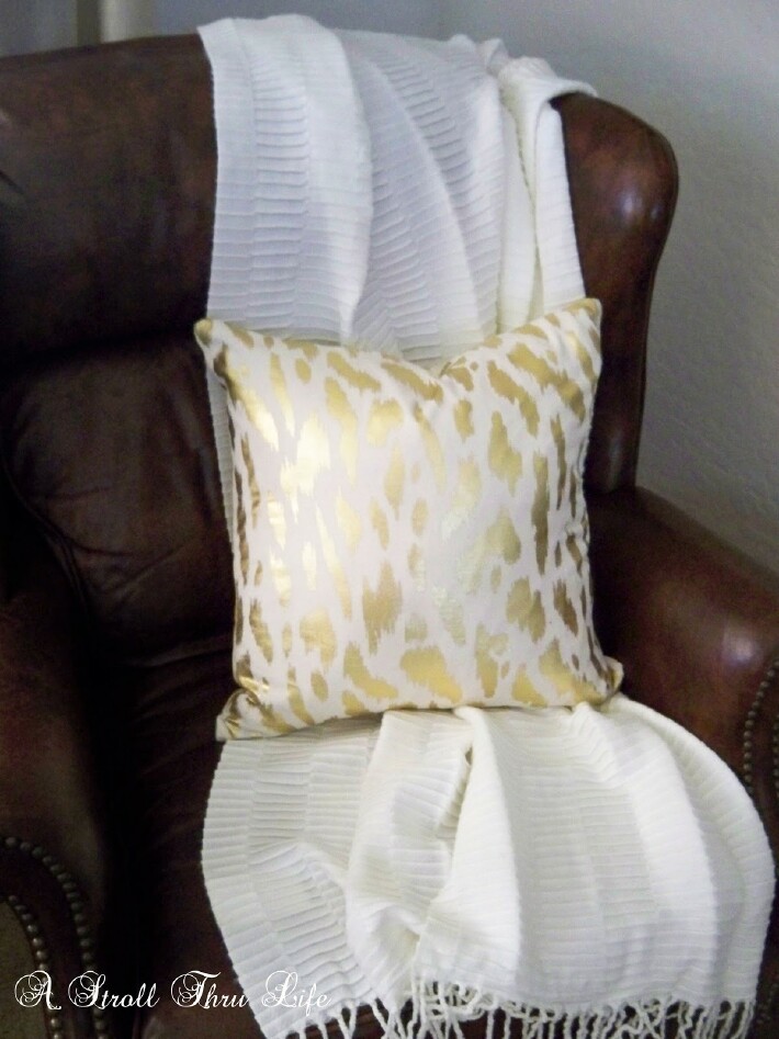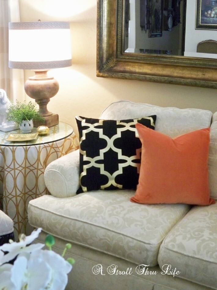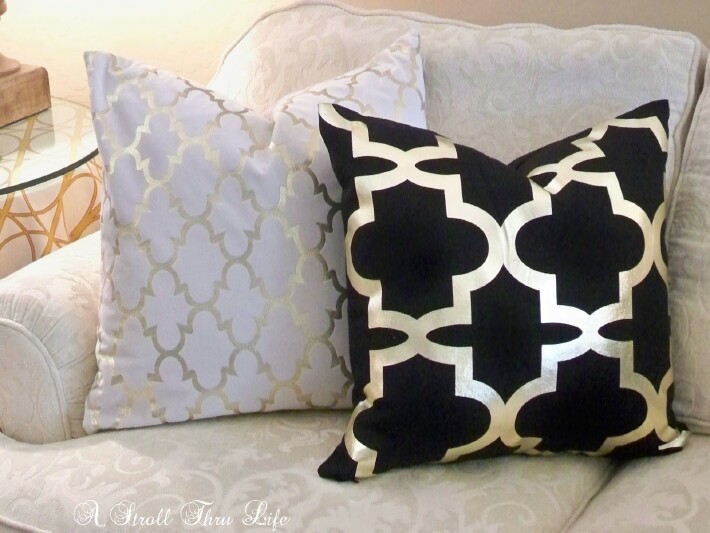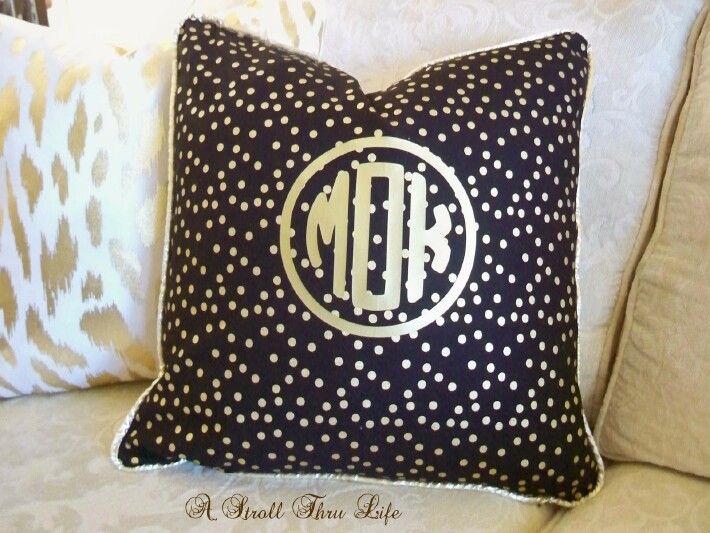 This pretty black and gold dot pillow was pretty just like it was, but there is a way to make it really special. What a difference. I found these custom iron on decals at 11 Magnolia Lane and now this pillow is fabulous.