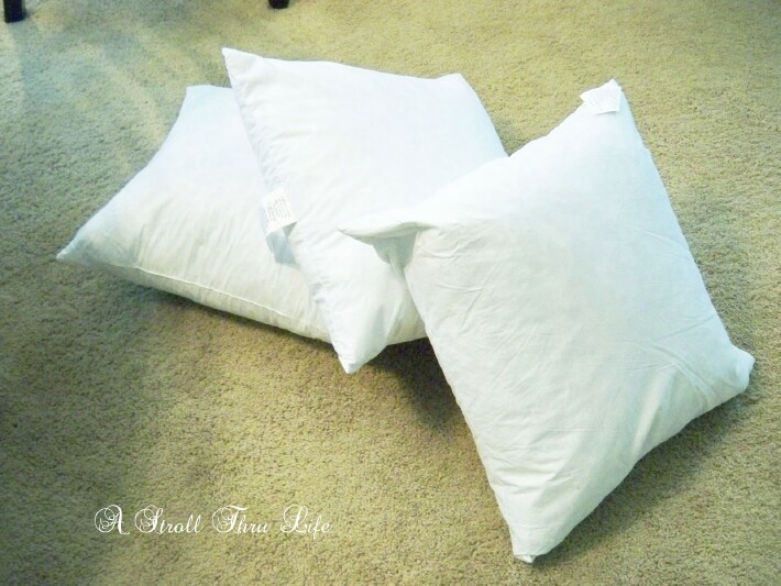 You can always find pillows stuffed with feather insert forms for $3 to $4 at goodwill, just unzip the yucky cover and use the feather insert in your gorgeous new pillow. Here are three that I just bought for $2.99 each. 2 are 20 x 20 and 1 is 22 x 22. My goodwill likes to sell the covers separate so I don’t even bring the covers home. I take them off in the store and give them back to them.