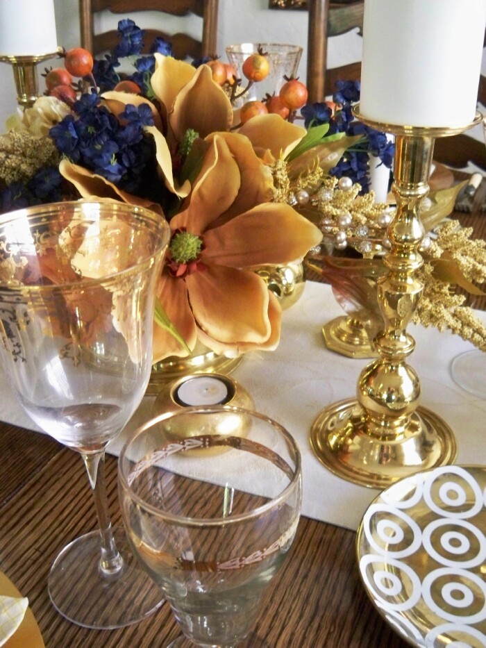 I love this pretty pastel table set by Stone Gable.  You could create something similar with grocery store pumpkins and a few leaves and twigs from the yard.  Then add in your pretty dishes and some glitz with a few candles and wow your guests.