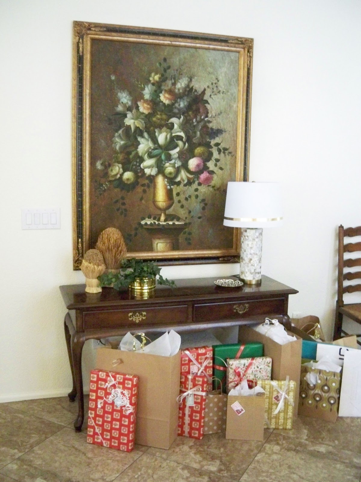 and I am so excited that we have an entrance wall.  We are joining all of our family at Church tonight and then to our daughters for dinner and opening presents.  There will be 12 of us, so these are the gifts I am taking for the gift exchange at her house.