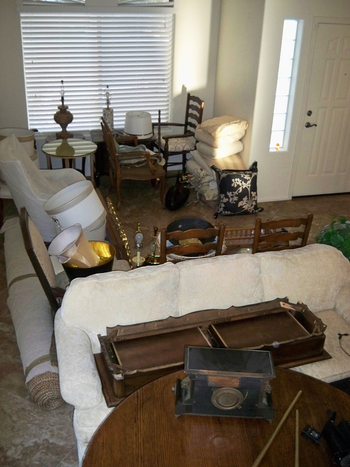 When the movers left Tuesday night, this is what this space looked like.  They just brought things in and set them down.  It was late, it took two trips to get everything from the old house, but they were great guys, so careful, so I was pleased with their work.  I think we made pretty good progress so for  and we even have our bed up. haha