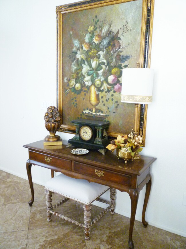 We are finally all cleared out and turned back into a liveable room so I am on a quest to decorate. I love this console table, it was a gift that is very precious to me and this large painting is one of my favorites also.