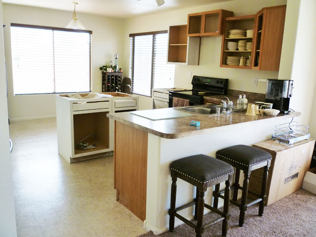 No frills – “Builder Basic”. That is one of the things I liked most about the house, I could do anything I wanted to it and I didn’t have to work around upgrades that I didn’t like. This kitchen was really shy on cabinet space, so I decided to rearrange a couple of cabinets and add a few more.