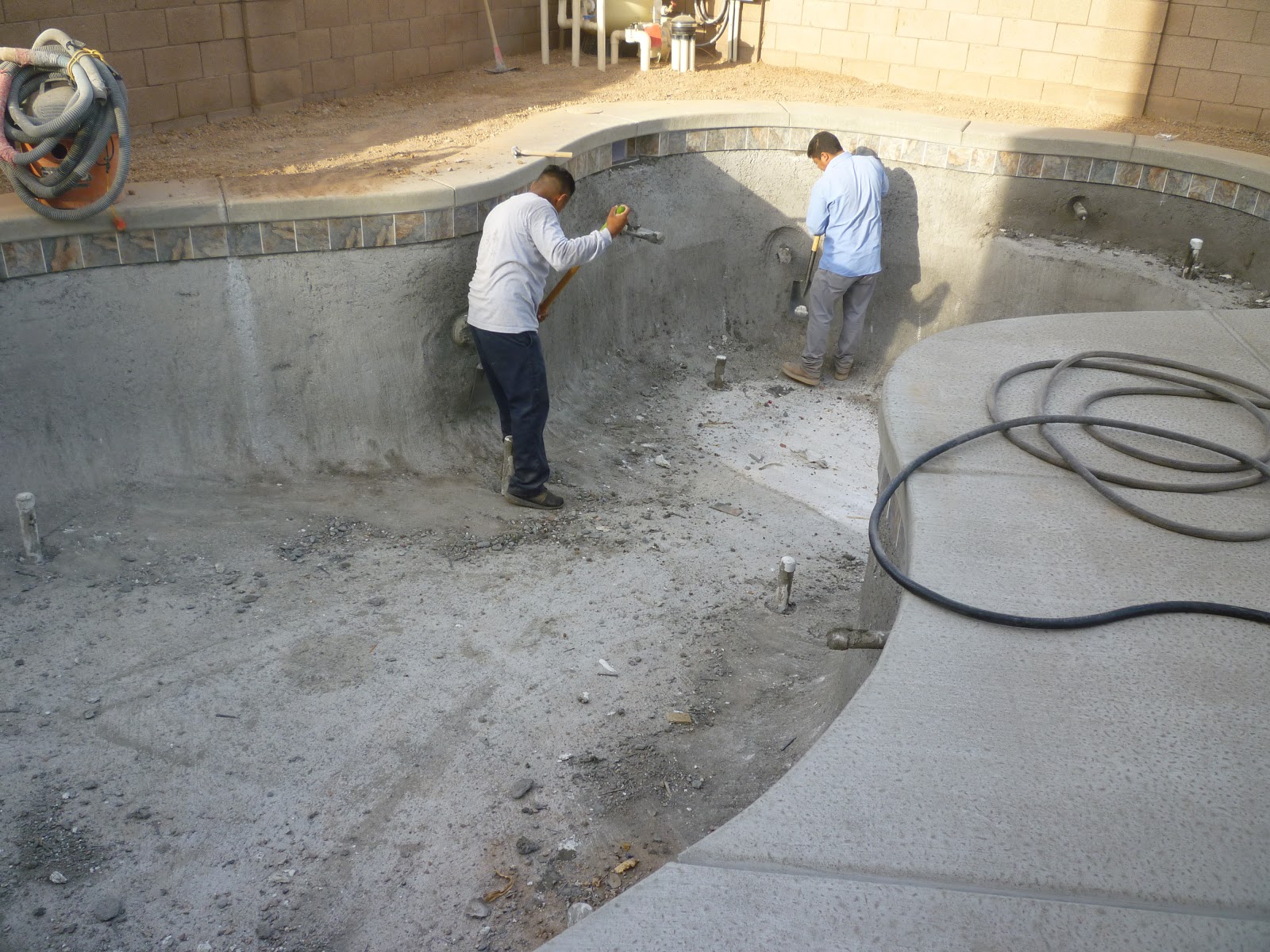You wouldn’t have believed how much debris all these other crews dumped into the bottom of the pool.  These guys had to scrape every inch of the pool with a shovel to get bits and pieces of cement, mortar and grout up, plus just plain ole’ trash.