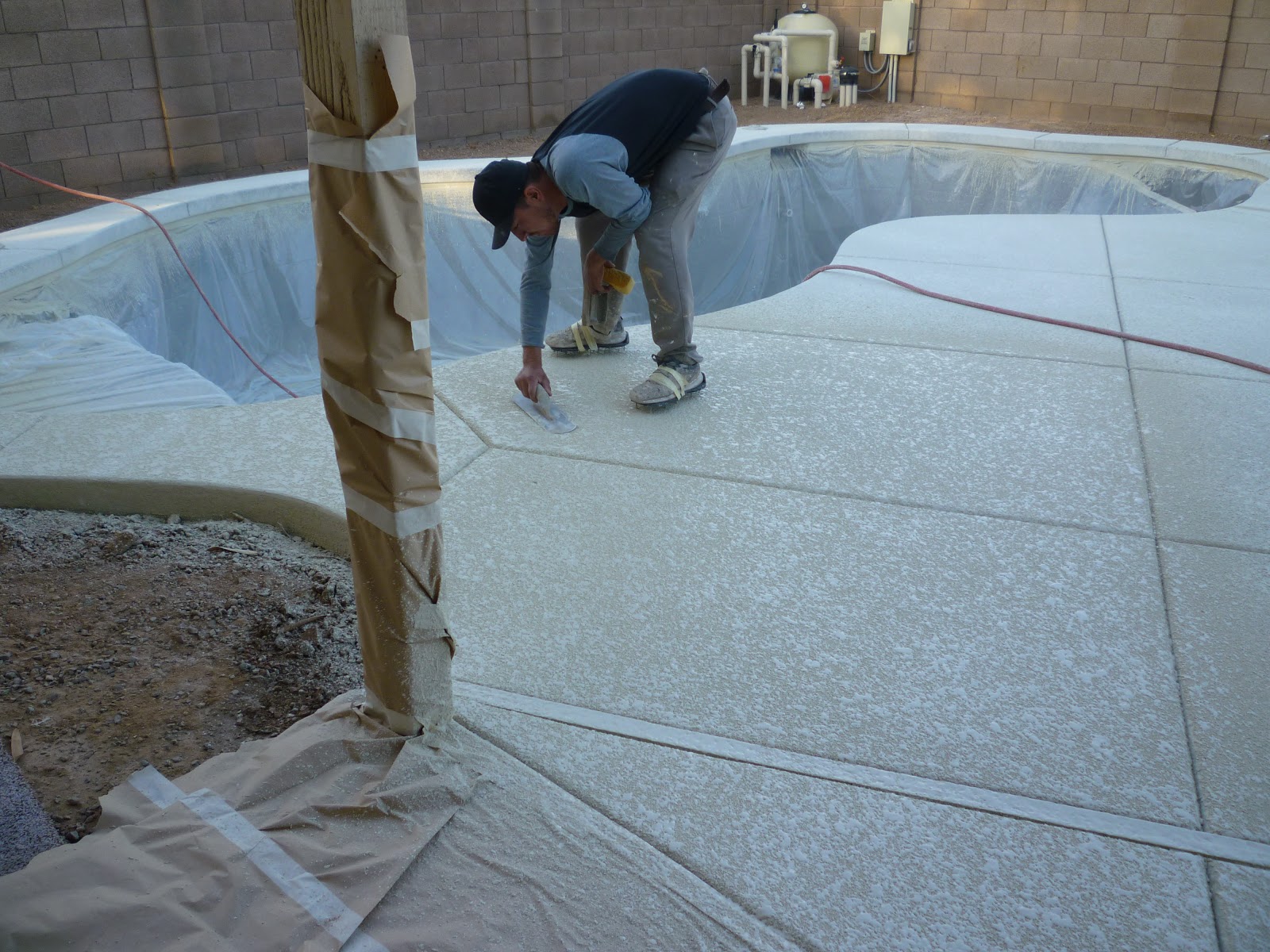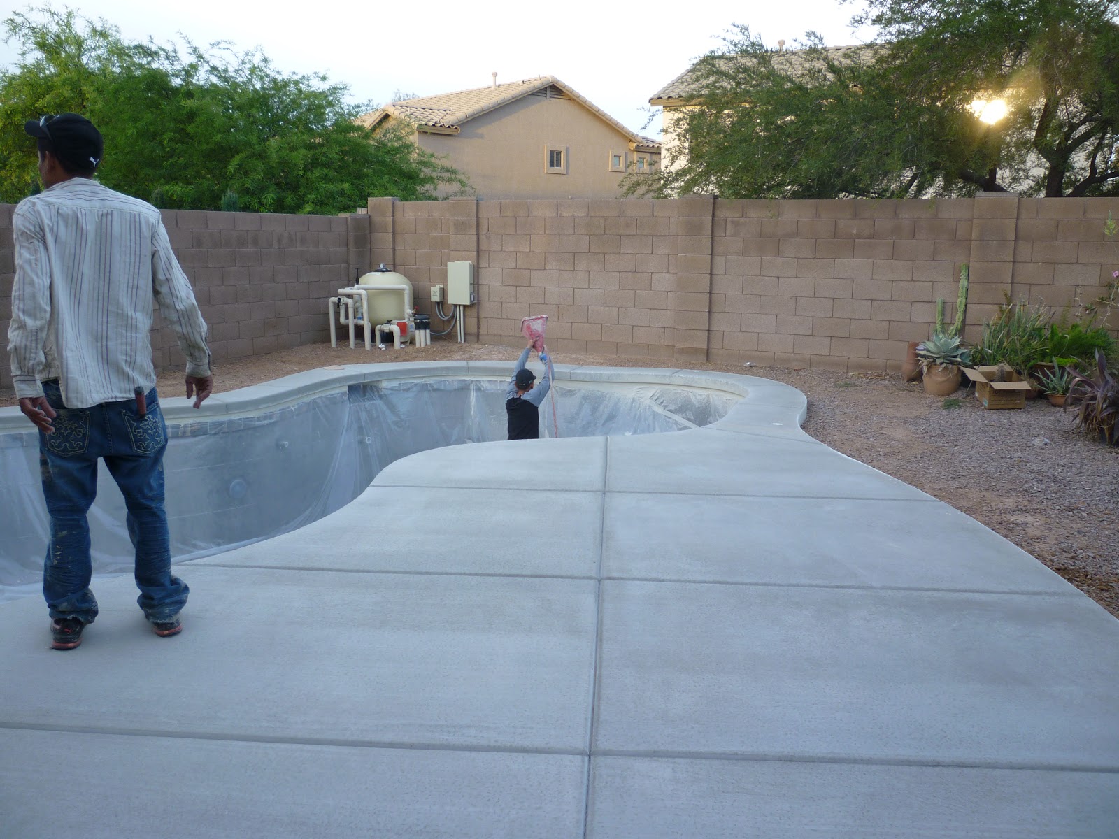 One guy is rolling out a huge sheet of plastic.  They are going to tape off the entire inside of the pool.  Another one is getting ready to cover a hair line crack in the cement.