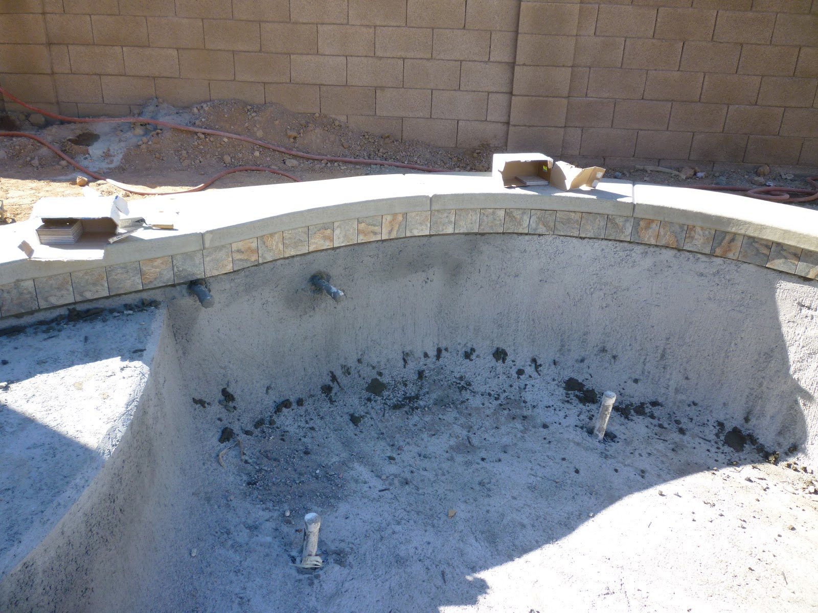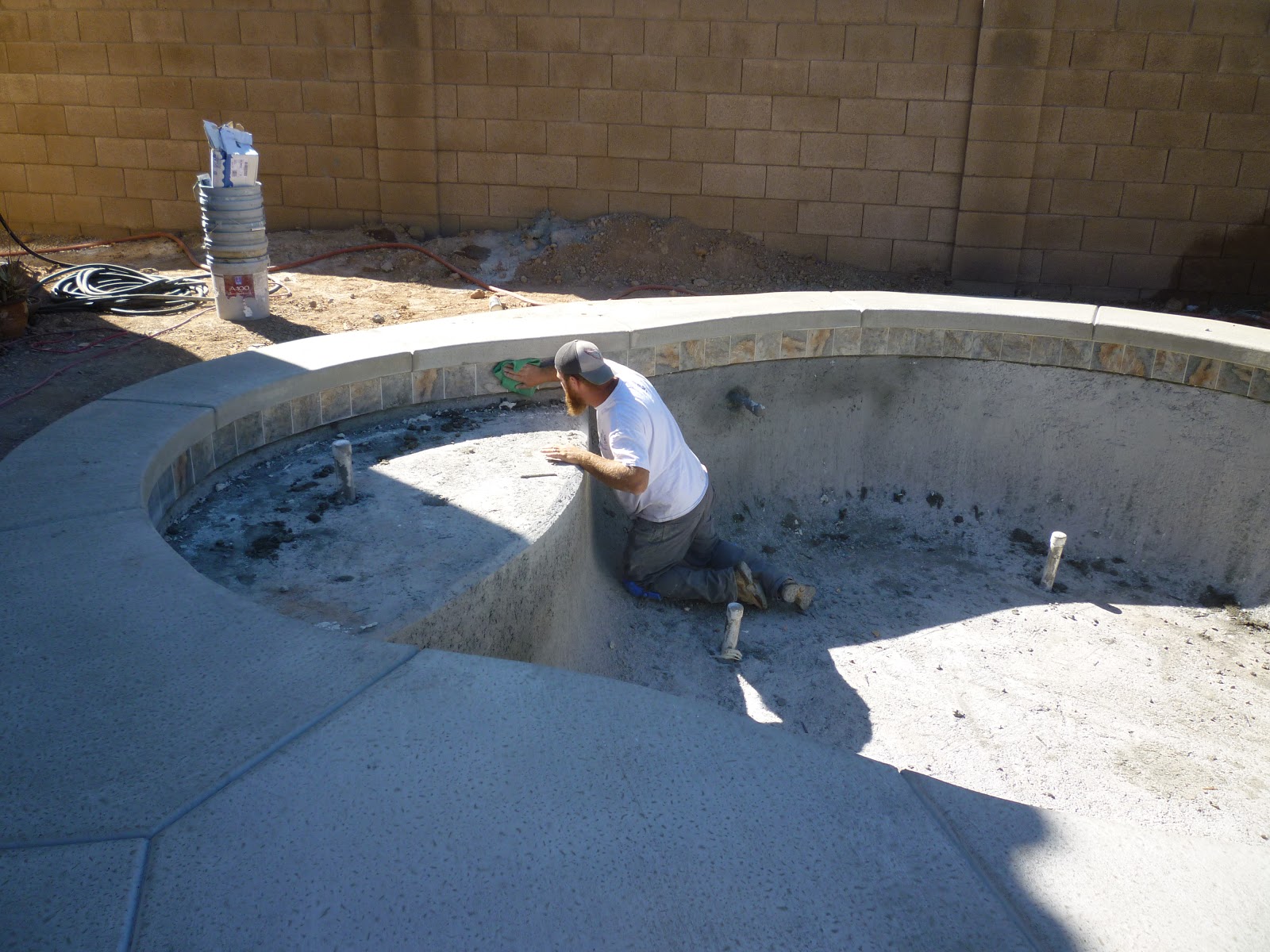 5/26 – We got tile!!!  Two guys showed up on Friday before the holiday and in about 2 hours, we had tile.  One guy mixed up a bunch of cement and the other one started brushing down the edge of the pool.