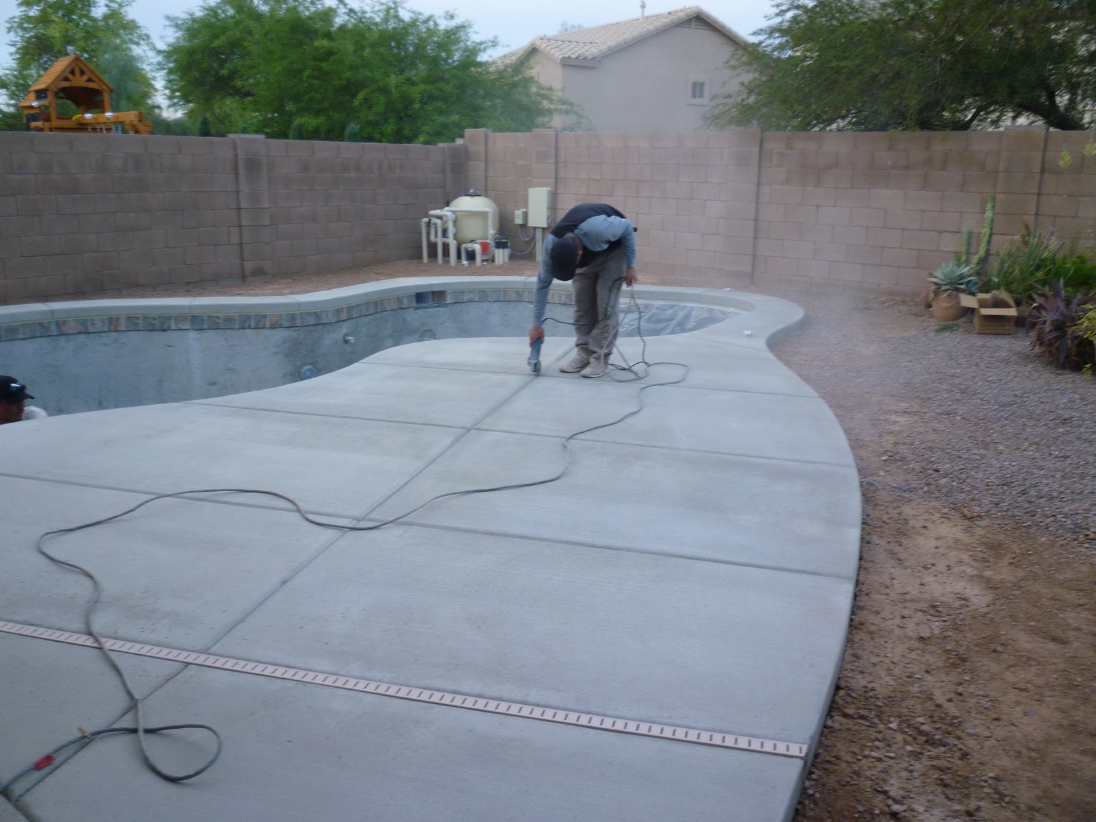 Immediately this guy wearing cleats starts to smooth down the texture.  This guy goes over the entire decking by hand.  Can you imagine bending over like that and working all day?