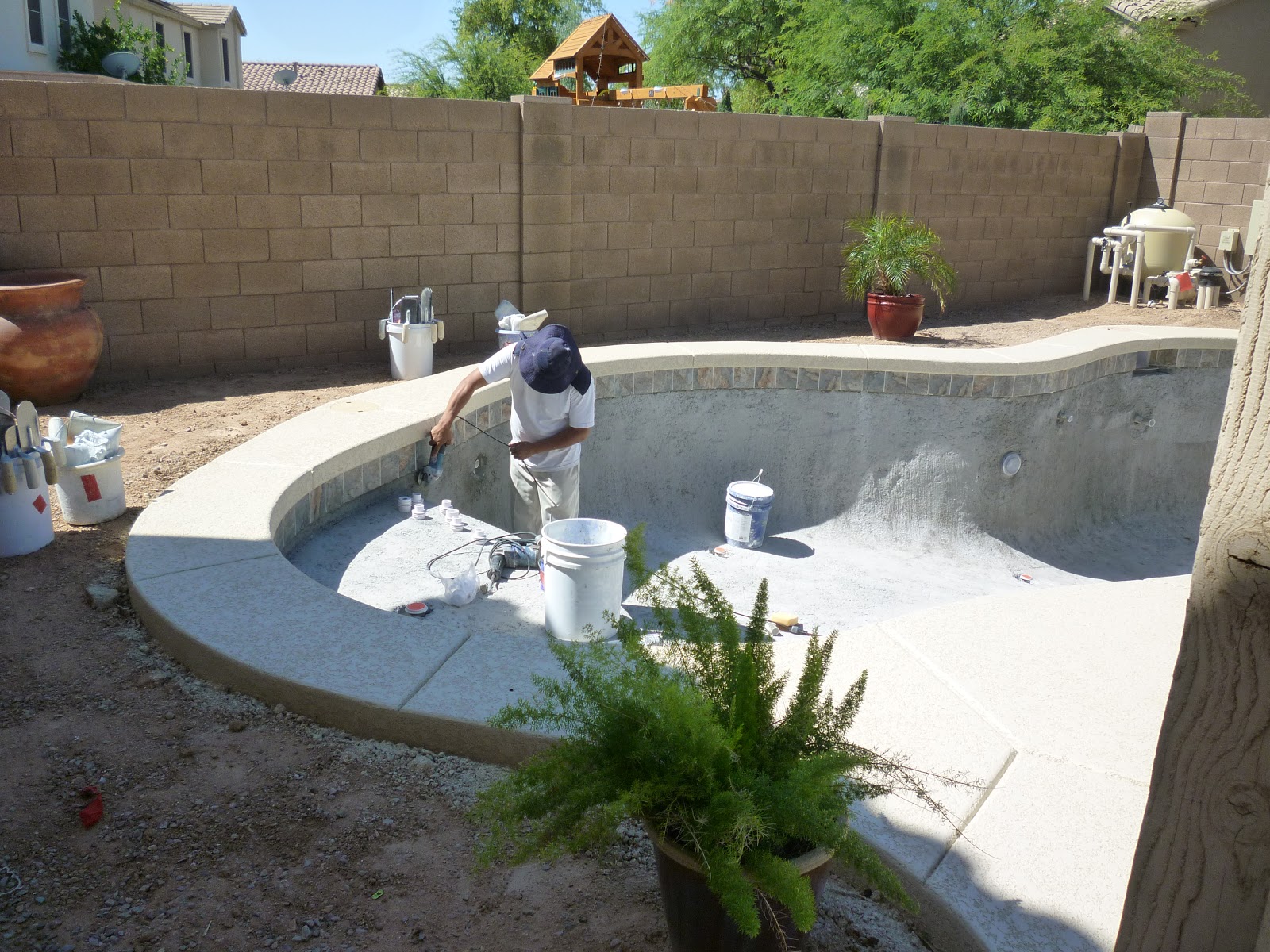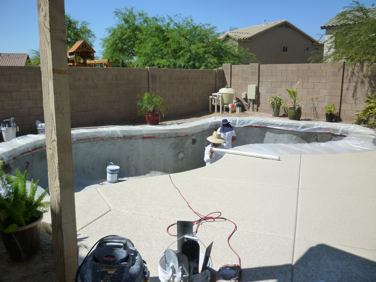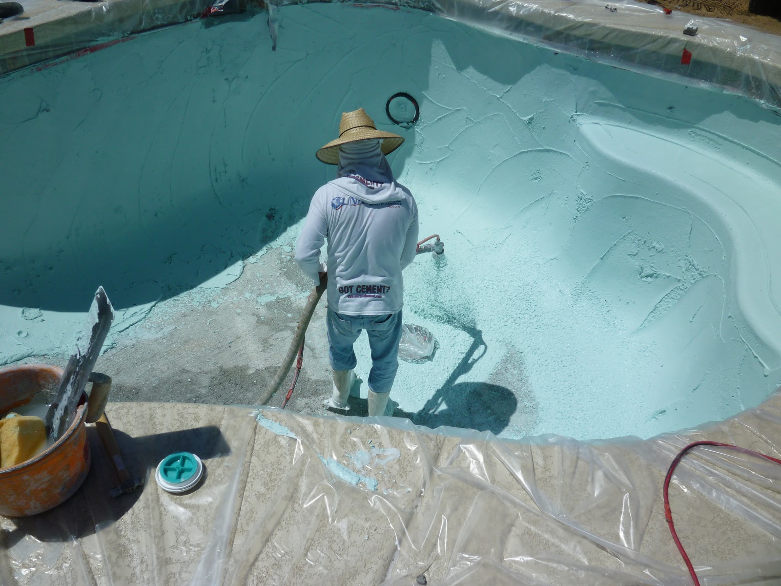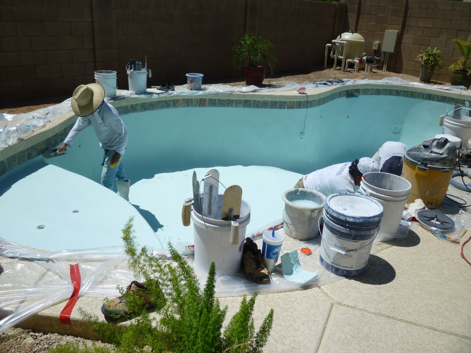 6/5 A crew of 5 showed up to do the plaster inside the pool  We chose a product called Pebble Sheen.  It has a really smooth surface to it with really tiny pebbles that give the plaster some texture and character.