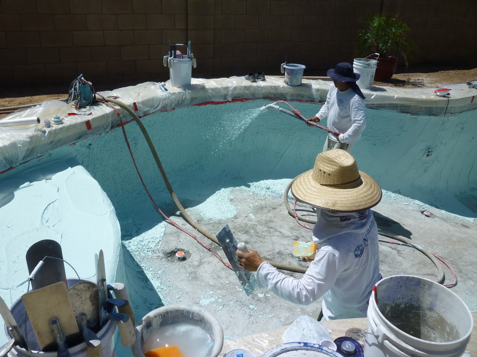 There was a big truck out front that had the plaster mix in a big hopper.  They brought a big long hose to the backyard and started spraying it in the pool.  As fast as they sprayed it in, one of the guys started a rough trowel.