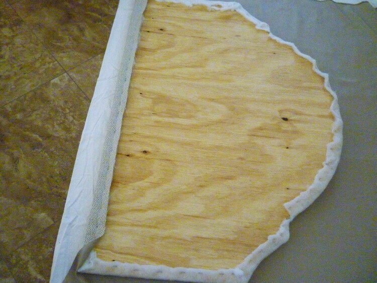 A trip to Lowes and I had a piece of plywood. We traced the outline and cut out the design, then I covered it in two layers of batting. Now to do the fabric.