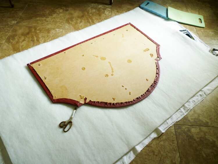I had everything all layed out. The red leather cover that was on the insert had a small piece of foam attached to it, I didn’t take that cover off, in fact I wanted more padding, so I layed it down on a thick piece of batting and cut around it so I could start stapling it on. However that particle board they used was so hard I couldn’t get a staple to go into it. Not sure what kind of staples they used, but I tried a hand stapler and my electric one and nothing would penetrate that board. I even tried a nail and I couldn’t get it to go in either without bending. So back to the drawing board.